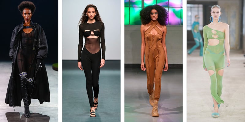 Embracing every curve with their skin-tight silhouettes, catsuits champion the female body. From the neon pink cut out catsuits at Gen Z-favorite Poster Girl to lingerie-inspired sheer versions at Nensi Dojaka, the catsuit is a symbol of the self-empowered female gaze. Mark Fast channeled his former life as a raver through his catsuits that merged the principles of club dresses and sportswear into one sensual garment that flatters all bodies.