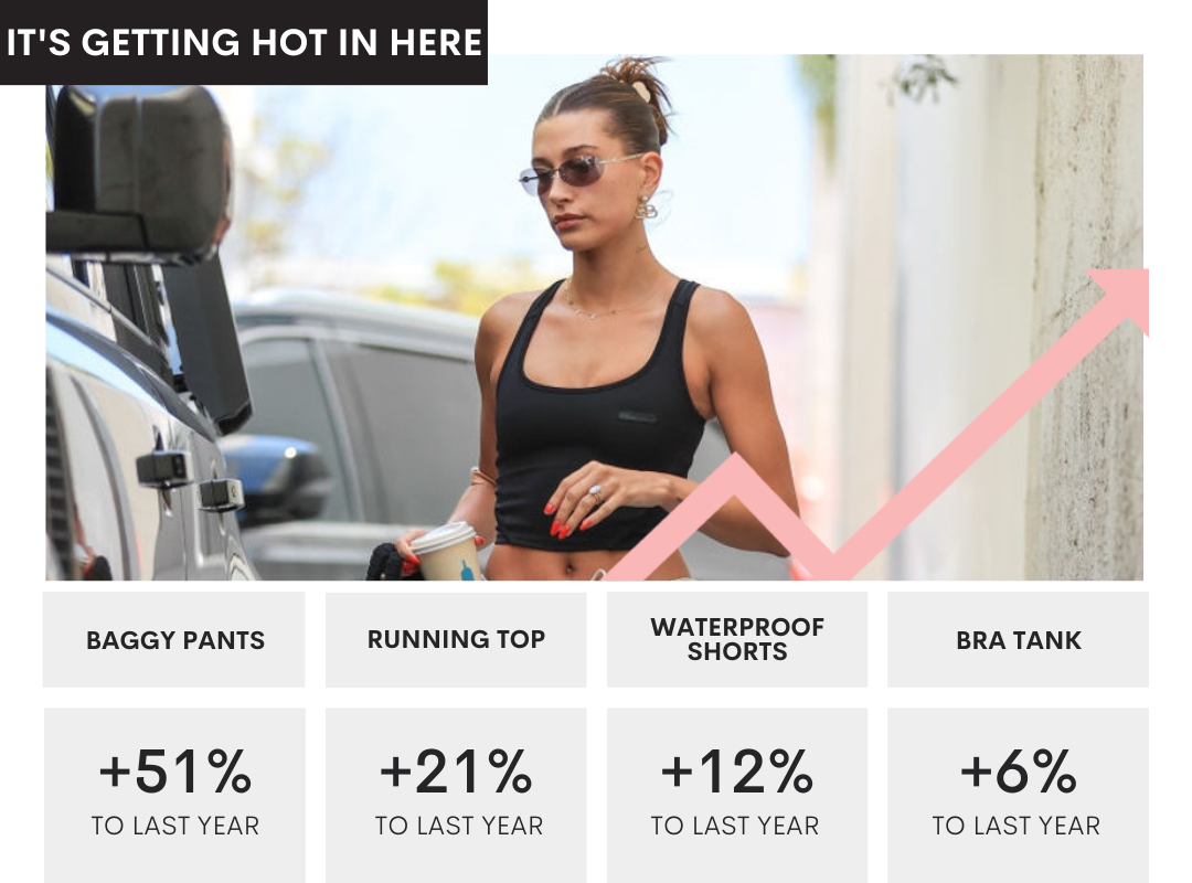 This year, “Hot Girl Summer” is taking a literal turn as heat waves scorch the nation. From a practical standpoint, waterproof shorts (+12% to LY) and the running top (+21% to LY) are casual staples driving interest. Meanwhile, the desire to “look good, feel good” has furthered trends like the bra tank (+6% to LY) and baggy pants (+51% to LY) –– a look often rocked by trendsetters like Bella Hadid and Hailey Bieber.