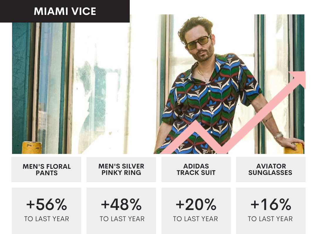 The Miami Vice aesthetic offers a summery lens to the typical urban uniform that is quickly being adapted by men on the coasts, including the “East Villain” stereotype that went viral on TikTok, picked up by The Cut. In addition to an update on the Cuban collar shirt, men’s floral pants (+56% to LY), Adidas track suit (+20% to LY), aviator sunglasses (+16% to LY) and the men’s silver pinky ring (+48% to LY) are prime examples of accessories driving this trend.