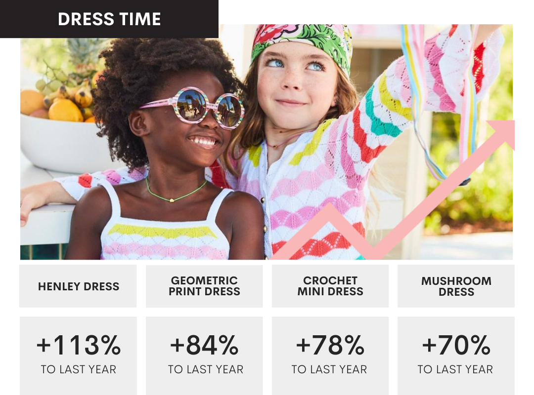 Dresses are the go-to style solution for the heat of the summer months and act as an easy vehicle for translating contemporary market trends for the younger set of shoppers. This year leading styles like the crochet mini dress (+78%), henley dress (+113% to LY) and prairie dress (+9% to LY) work nicely for teens while an of-the-moment geometric print dress (+84% to LY) and mushroom dress (+70% to LY) translate typically junior prints and graphics for kids.