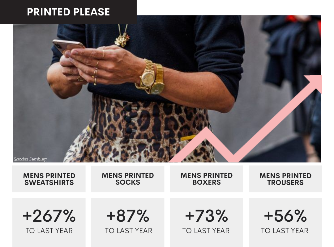 Men's footwear trends are veering outside of traditional sneakers and oxfords this season. For example, leather cowboy boots (+157% to LY) and mens skater shoes (+129% to LY) are leading in searches followed closely by mens heeled boots (+50% to LY)—a street style top trend—and recovery shoes (+128% to LY).